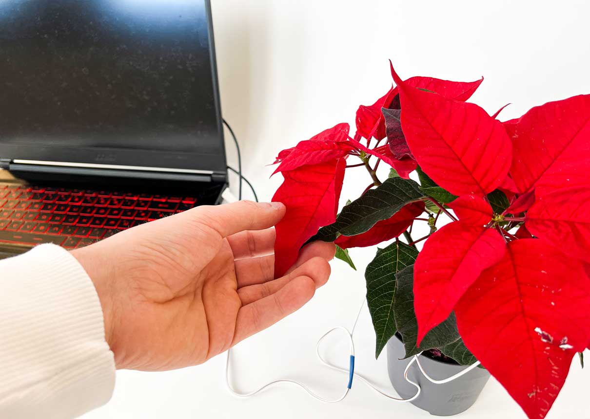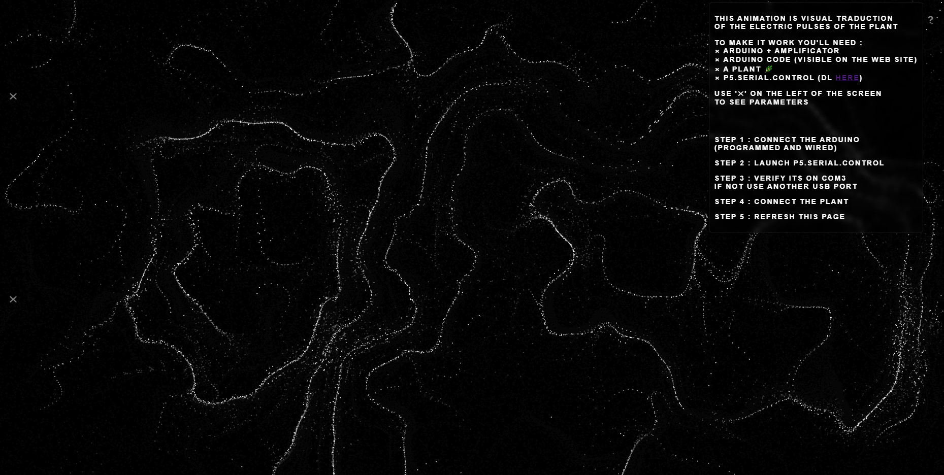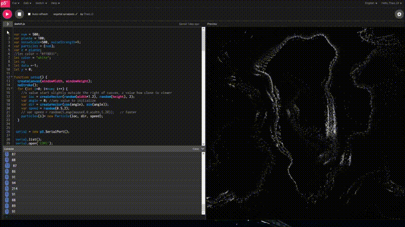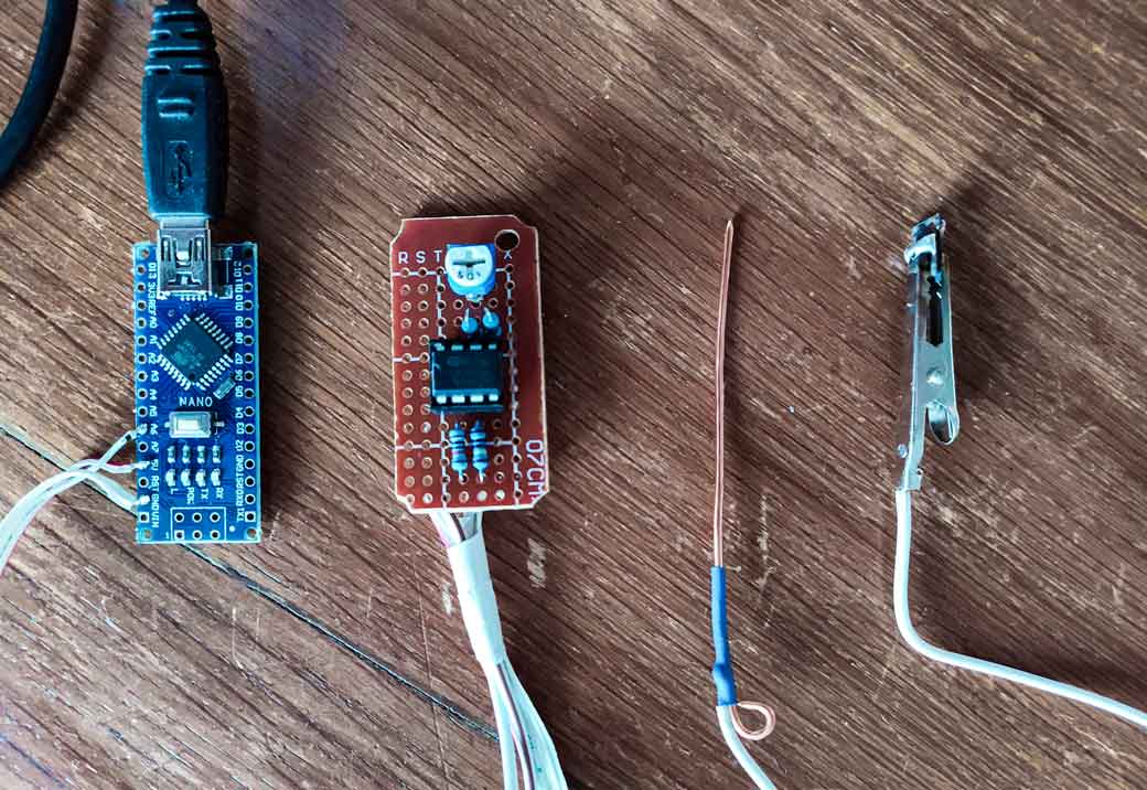 J'espère capter l'activité électrique de la plante grâce aux sondes, afin de les réinjecter dans un script de creative coding pour le faire évoluer au rythme de la vie "psycho-biologique" de la plante.